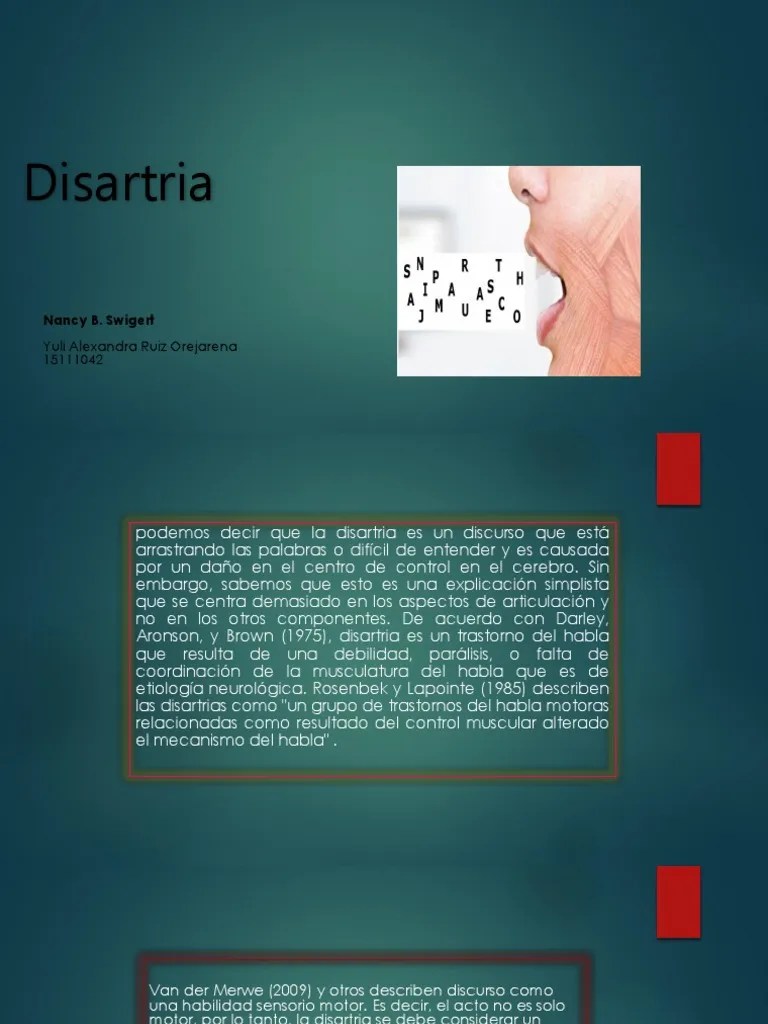 La disartria es una alteración de la articulación propia de lesiones en el sistema nervioso central (snc), así como de enfermedades de los nervios o de los músculos de la lengua, faringe y laringe, responsables del habla. La disartria es una alteración de la articulación propia de lesiones en el sistema nervioso central (snc), así como de enfermedades de los nervios o de los músculos de la lengua, faringe y laringe, responsables del habla. Entre las cosas que la familia y amigos pueden hacer para comunicarse mejor con alguien que tiene disartria están: Para este efecto, le proporcionamos información y educación. Nuestro objetivo es que usted desempeñe un papel activo en su cuidado y tratamiento; Es un trastorno que afecta al habla causado por un daño de los tractos corticobulbares. El origen suele ser consecuencia de accidentes vasculares, traumatismos craneales, esclerosis múltiple, encefalitis, tumores extensos o enfermedades degenerativas. Afecta a los movimientos voluntarios del mecanismo del habla. Asegurarse de que la iluminación en la habitación esté bien. Disartria el propósito de este documento no es remplazar el cuidado y la atención de su médico u otros servicios médicos profesionales.