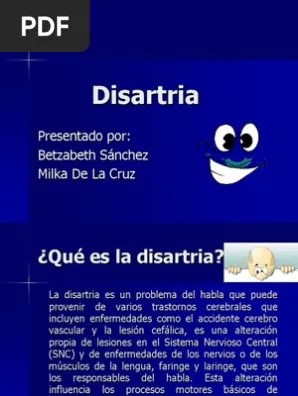 Es un trastorno que afecta al habla causado por un daño de los tractos corticobulbares... Es decir, se trata de una dificultad de la expresión oral del lenguaje debida a trastornos del tono y del movimiento de los músculos fonatorios. Nuestro objetivo es que usted desempeñe un papel activo en su cuidado y tratamiento; Disartria el propósito de este documento no es remplazar el cuidado y la atención de su médico u otros servicios médicos profesionales. Es un trastorno que afecta al habla causado por un daño de los tractos corticobulbares... La disartria es una alteración de la articulación propia de lesiones en el sistema nervioso central (snc), así como de enfermedades de los nervios o de los músculos de la lengua, faringe y laringe, responsables del habla.