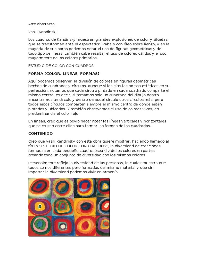 En un bello ejercicio de abstracción, el visionario pintor ruso describió el sonido de cada uno de los colores…... Corta los cuadrados con una tijera y pégalos todos para crear un hermoso mural estilo kandinsky. Ver calidad de este cuadro. Aquí «agudo» se refiere al ángulo.